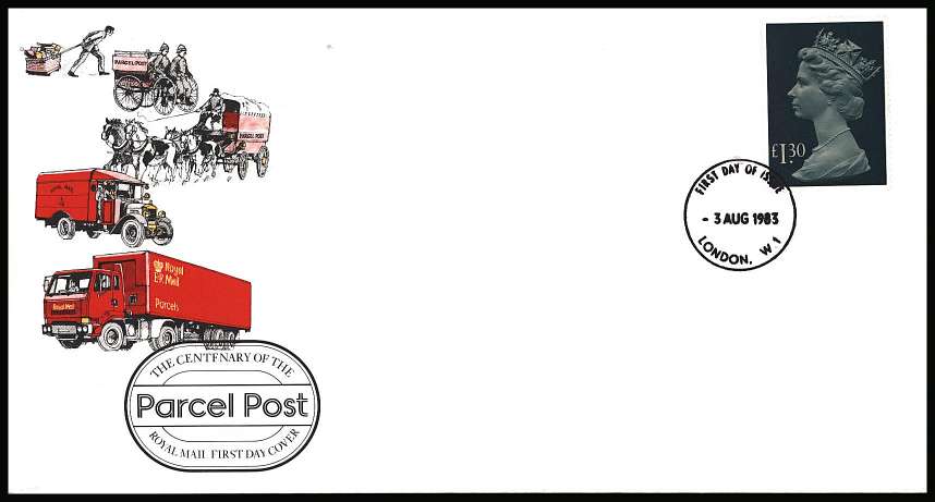 £1.30 Pale Drab and Greenish Blue Machin High Value single on an unaddressed Royal Mail official FDC cancelled with a LONDON W.1 FDI cancel dated 3 AUG 1983
