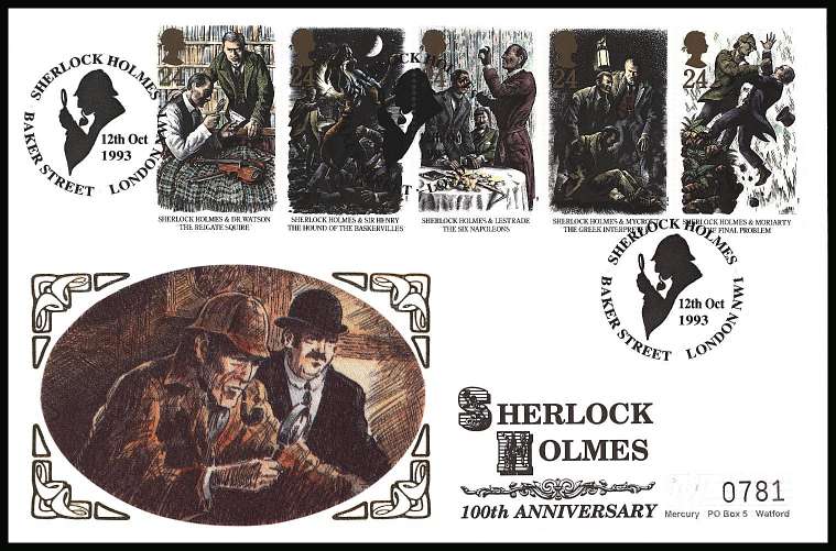 Sherlock Holmes strip of five on a neatly typed addressed official Royal Mail FDC cancelled with the PHILATELIC BUREAU FDI dated 12 OCTOBER 1993. |