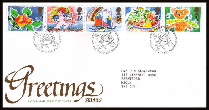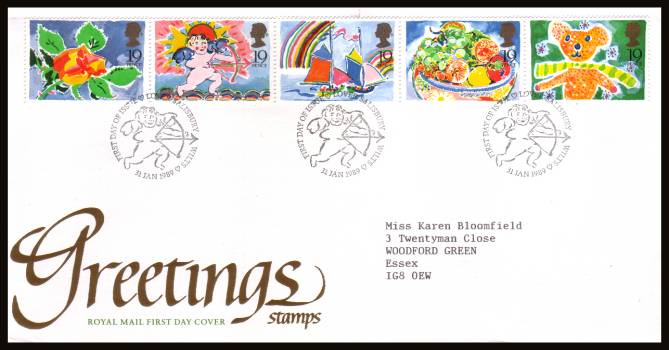 Greetings Stamps set of five in vertical pairs, ex booklet on five different Fleetwood unaddressed FDC's cancelled with a strike of the PHILATELIC BUREAU - EDINBURGH handstamp dated 31 JAN 1989
