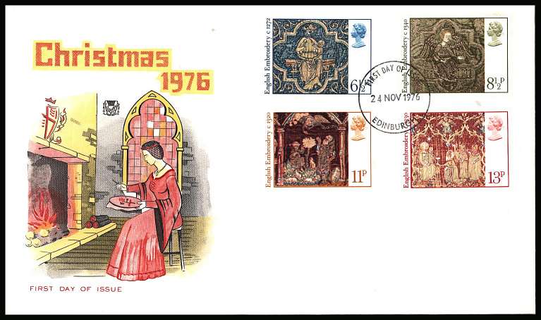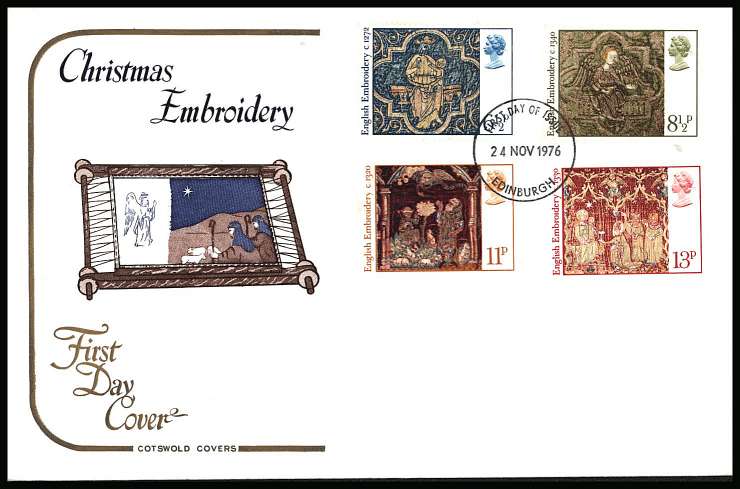 Christmas - Medieval Embroidery set of four on an unaddressed COTSWOLD FDC cancelled with a EDINBURGH FDI cancel dated 24 NOV 76. |