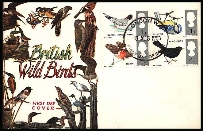 British Birds PHOSPHOR block of four on an UNADDRESSED CONNOISSEUR colour illustrated FDC cancelled with the FDI cancel for LONDON W.C dated 8 AUG 1966. KKL |