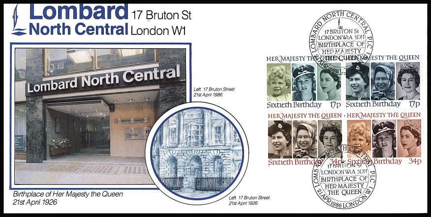60th Birthday of The Queen set of four on an unaddressed OFFICAL colour FDC by G&P cancelled with two strikes of LOMBARD NORTH CENTRAL PLC - LONDON W1 dated 21 APR 1986. Only 500 covers produced.