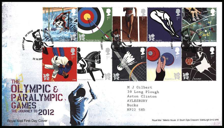 Olympic Games - 1st Issue - on a neatly typed addressed official Royal Mail FDC cancelled with the official alternative FDI cancel for BADMINGTON - GLOS dated 22 10 2009. |