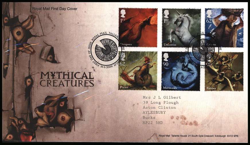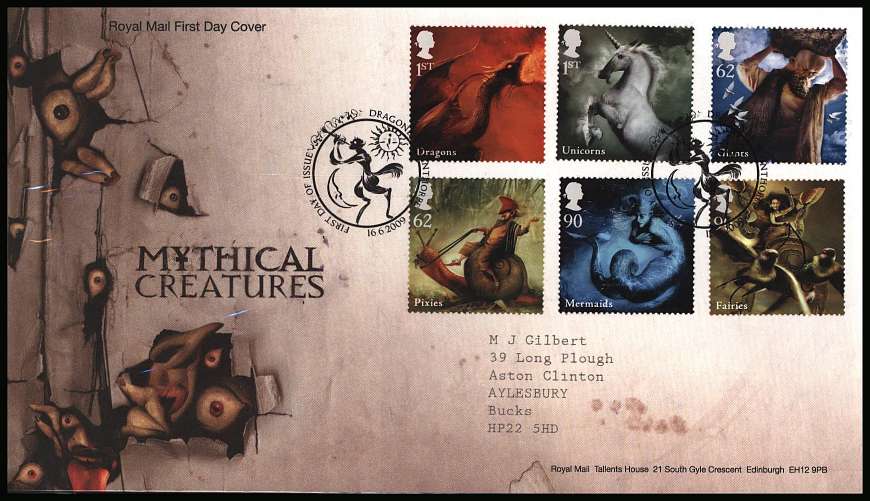 Mythical Creatures on a typed addressed official Royal Mail FDC cancelled with two strikes of ROYAL MAIL - TALLENTS HOUSE - EDINBURGH FDI cancel for 16 6 2009. |