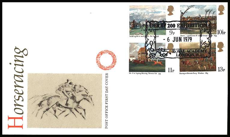 Horseracing Paintings set of four on an UNADDRESSED official colour Post Office FDC cancelled with a strike of the special handstamp for DERBY 200 EXHIBITION - ROYAL ACADEMY - LONDON W.1. dated -6 JUN 1979. KKL |