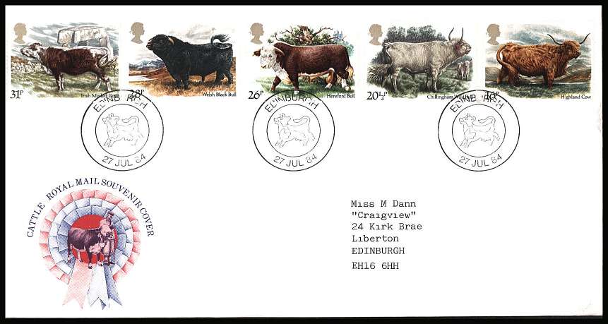 British Cattle set of five on a neatly typed addressed official Royal Mail FDC cancelled with three strikes of the EDINBURGH handstamp dated 27 JUL 84. NOTE this is not a FDC but issued ''WITH THE COMPLIMENTS OF DAIRYLEA''. |