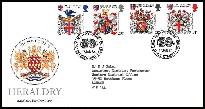 College of Arms - Heraldry set of four on official neatly typed addressed Royal Mail FDC to the DISTRICT POSTMASTER cancelled with two strikes POST OFFICE STAMP PRINTING - HIGH WYCOMBE special handstamp dated 17 JAN 84.