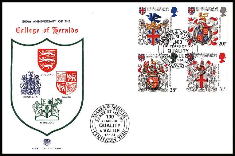 College of Arms - Heraldry set of four on an unaddressed Stuart FDC cancelled with two strikes of the MARKS & SPENCER - CENTENARY YEAR special handstamp dated 17-1-84