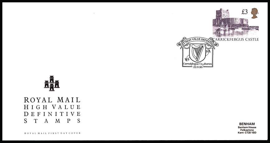 £3 Reddish Violet and Gold "Castle" on a neatly typed addressed official Royal Mail FDC cancelled with a CARRICKFERGUS FDI cancel dated 22 AUG 1995