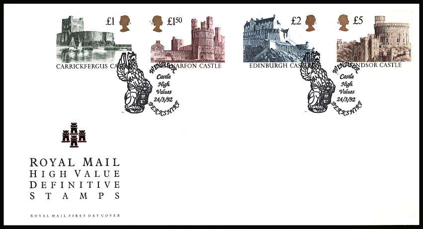 Castles ''GOLD HEAD'' High Values set of four on an unaddressed official Royal Mail FDC cancelled with the special FDI cancel for CASTLE HIGH VALUES - WINDSOR - BERKSHIRE dated 24/3/92.