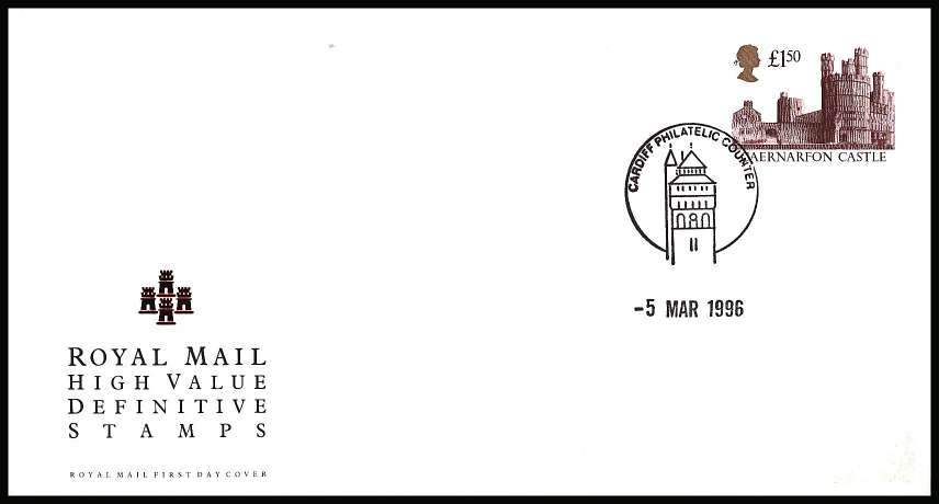 Gum change to PVA on an unaddressed official Royal Mail FDC cancelled with a CARDIFF PHILATELIC COUNTER handstamp (for CAERNARFON CASTLE) dated 5 MAR 1996.