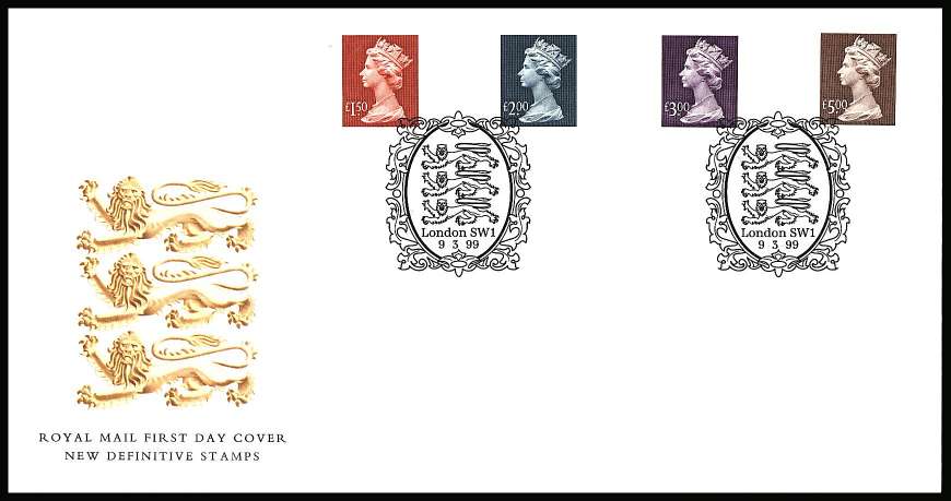 The Engraved ''High Values'' by Slania set of four on an unaddressed official Royal Mail FDC cancelled with the two strikes of the special handstamp for LONDON dated 9.3.99