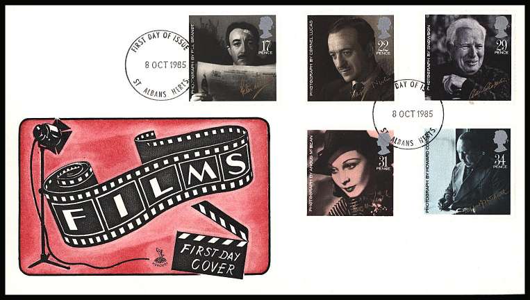 British Film Year set of five on an unaddressed Mercury FDC cancelled with two strikes of a ST. ALBANS - HERTS FDI cancel dated 8 OCT 1985