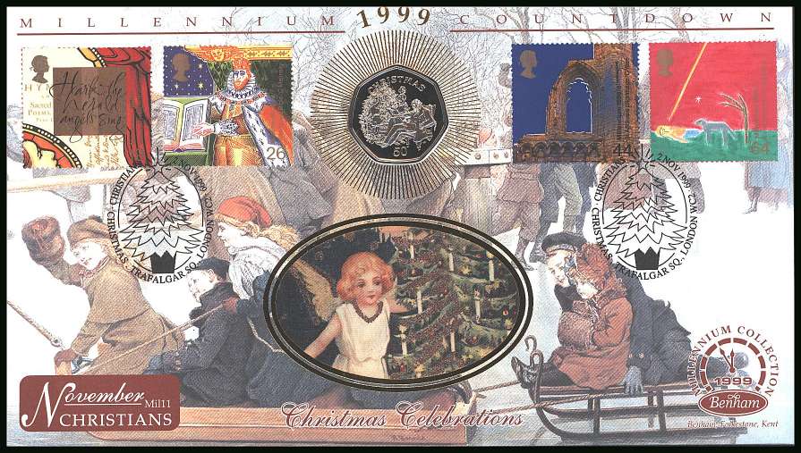 Millennium Series - The Christians' Tale - Benham coin FDC cover containing a Chrismas ISLE OF MAN 50p coin. With BENHAM guarantee certificate - only 1000 produced. |