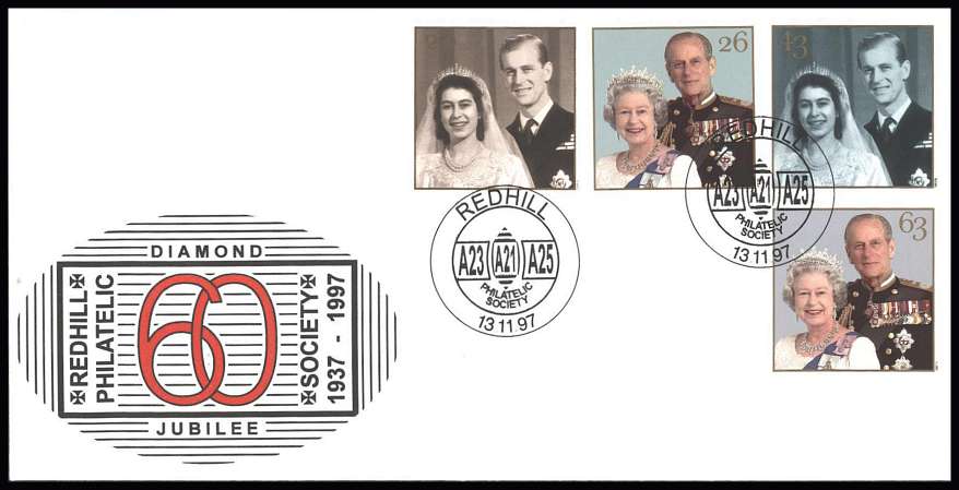 Royal Golden Wedding set of four on a REDHILL PHILATELIC SOCIETY official unaddressed FDC cancelled with two strikes of the special handstamp for REDHILL PHILATELIC SOCIETY dated 13.11.97