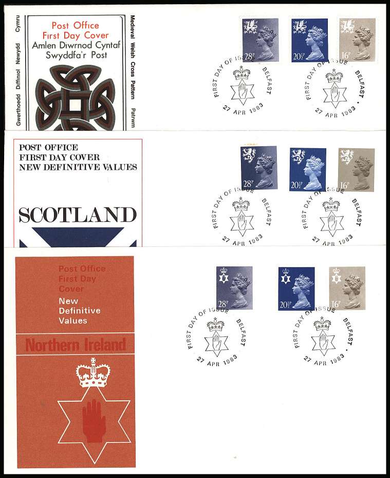 Regionals 16p 20½ 28p set of three on three unaddressed (pencil removed) official Royal Mail FDCs for SCOTLAND, WALES and NORTHERN IRELAND cancelled with official alternative FDI cancels dated dated 27 APR 1983. |