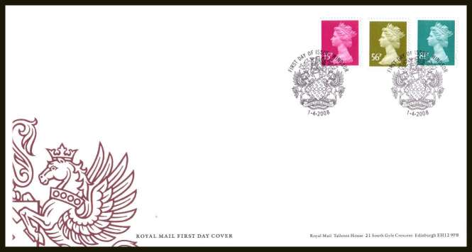 Machin - Elliptical Perforations - 15p-81p set of three on an unaddressed official Royal Mail FDC cancelled with the official alternative FDI cancel for WINDSOR dated 1 APRIL 2008.