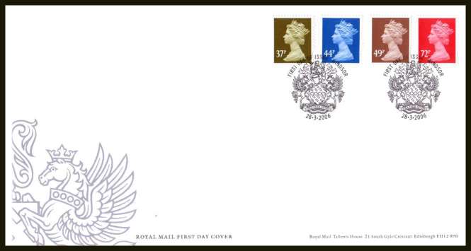 Machin - Elliptical Perforations - 37p - 72p set of four on an unaddressed official Royal Mail FDC cancelled with the official alternative FDI cancel for WINDSOR dated 28 MARCH 2006.