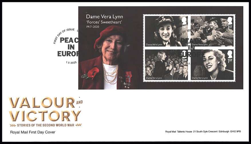 Valour and Victory - Dame Vera Lynn minisheet on an unaddressed official Royal Mail FDC cancelled with the official alternative FDI cancel for