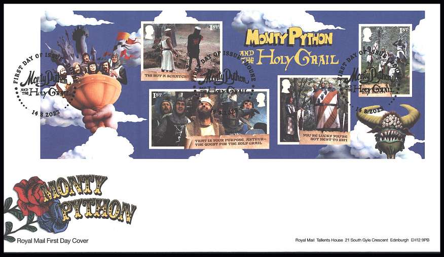 Monty Python and the Holy Grail minisheet on an unaddressed official Royal Mail FDC cancelled with the official alternative FDI cancel for DOUNE