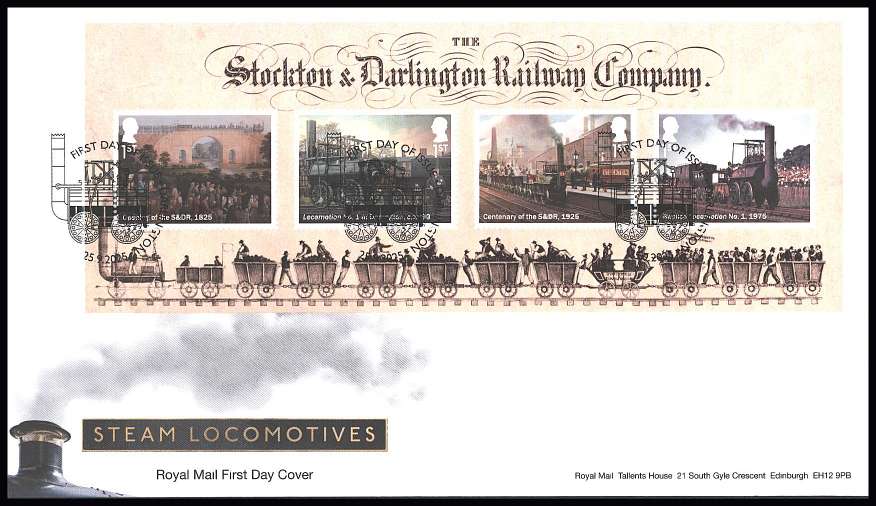 Steam Locomotives - Trains - Stockton & Darlington Railway Company minisheet on an unaddressed official Royal Mail FDC cancelled with the official alternative FDI cancel for DARLINGTON