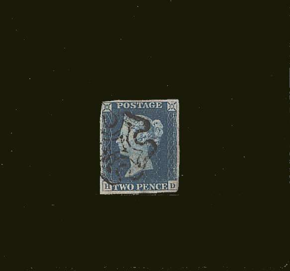 2d Pale Blue from Plate 2 lettered "T-H" cancelled with a RED Maltese Cross. The stamp is very bright a fresh and has four even large margins, a gem!