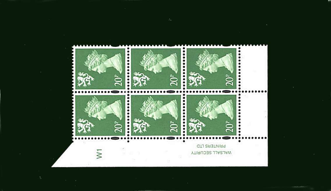 £4.50 Add British Stamps Regionals - Scotland Item: add 	20p Bright Green - Centre Band<br/>   in a superb unmounted mint cylinder block of six showing Cylinder W1 to your basket