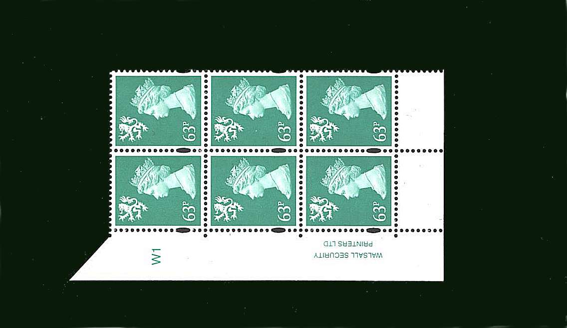 £19.50 Add British Stamps Regionals - Scotland Item: add 63p Light Emerald<br/>   in a superb unmounted mint cylinder block of six showing Cylinder W1 to your basket