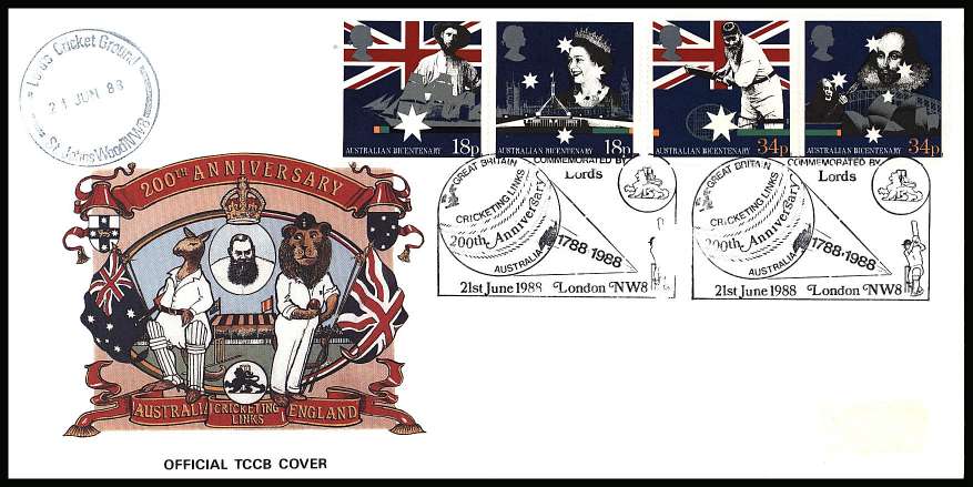 Australian Bicentenary set of four on an OFFICIAL unaddressed TCCB cricket colour FDC cancelled with two strikes of the CRICKETING LINKS - 200TH ANNIVERSARY - LONDON NW8 dated 21st JUNE 1988