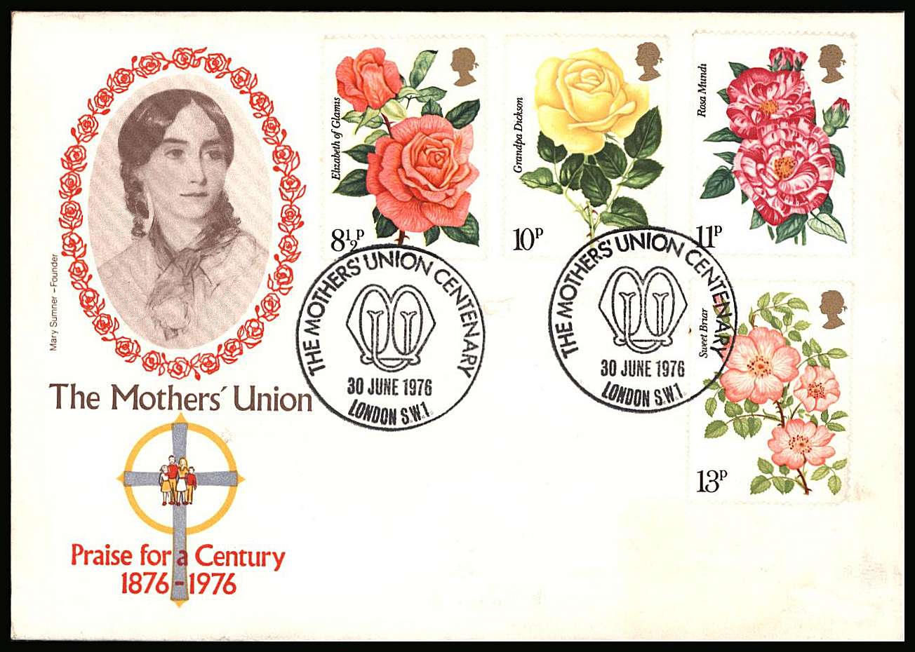 Roses set of four on an UNADDRESSED - OFFICIAL - ''MOTHERS UNION CENTENARY'' FDC cancelled with two strikes of the MOTHERS UNION CENTENARY -dated 30 June 1976. Note tiny corner fault on one stamp reflected in price! Cat £100