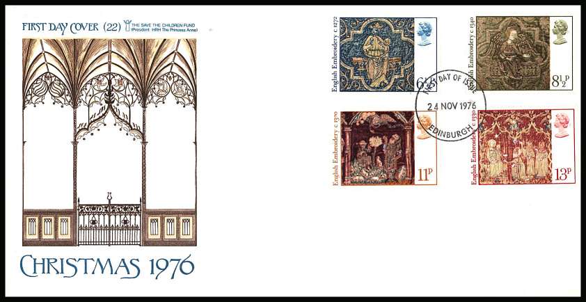 Christmas - Medieval Embroidery set of four on an unaddressed SAVE THE CHILDREN FUND FDC (No 22) cancelled with an EDINBURGH FDI dated 24 NOV 1976.