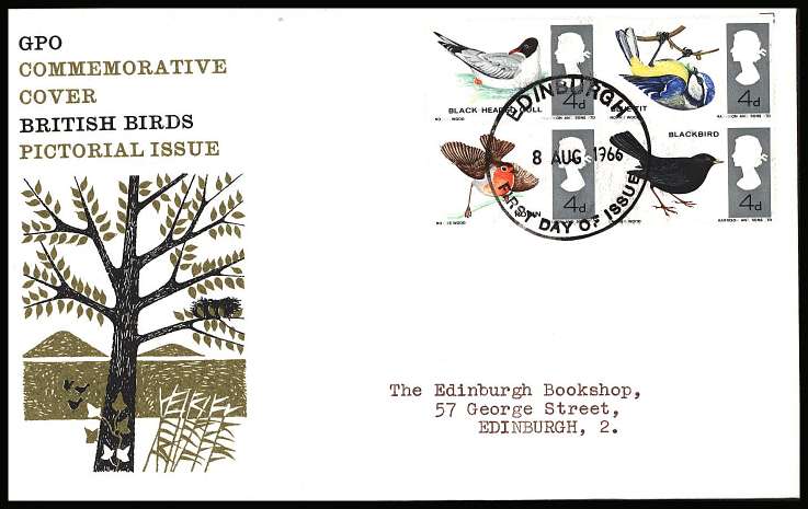 British Birds block of four on an official GPO illustrated typed addressed FDC cancelled with the FDI cancel for EDINBURGH dated 8 AUG 1966