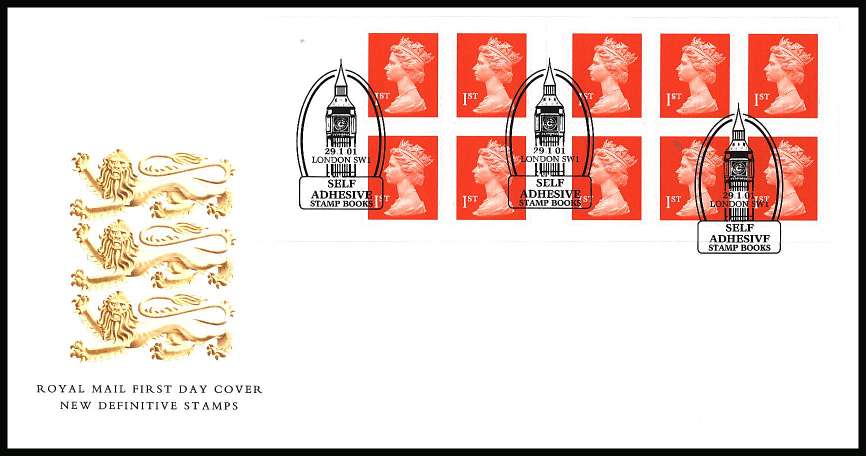 MACHIN - 1st x10 NVI Self Adhesive booklet pane on an unaddressed Royal Mail FDC cancelled with three strikes of the ''Elizabeth Clock Tower'' handstamp dated 29.1.01