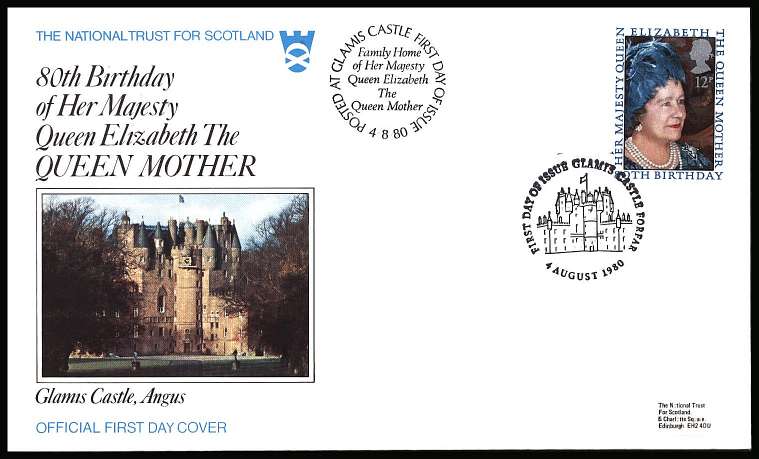 80th Birthdy of Queen Mother single on an OFFICIAL tiny label addressed colour FDC for THE NATIONAL TRUST FOR SCOTLAND cancelled with a strike of GLAMIS CASTLE - FORFAR dated 4 AUGUST 1980.KKL |