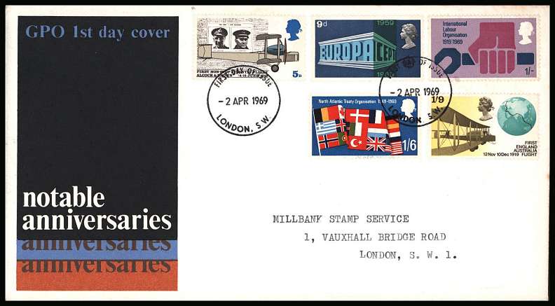 British Anniversaries set of five on neatly typed official Post Office FDC cancelled with special handstamp for ALCOCK & BROWN dated 2 APRIL 1969. |