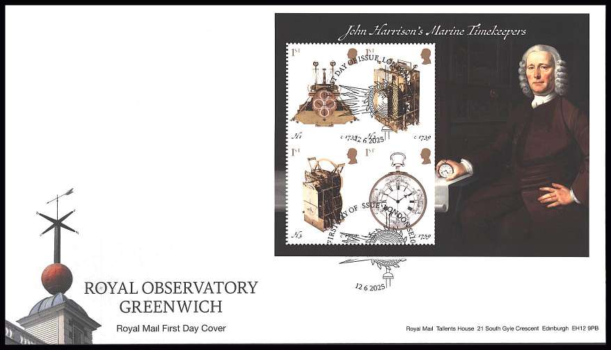 Royal Observatory - John Harrison Marine Timekeepers minisheet on an unaddressed official Royal Mail FDC cancelled with the official alternative FDI cancel for LONDON SE10