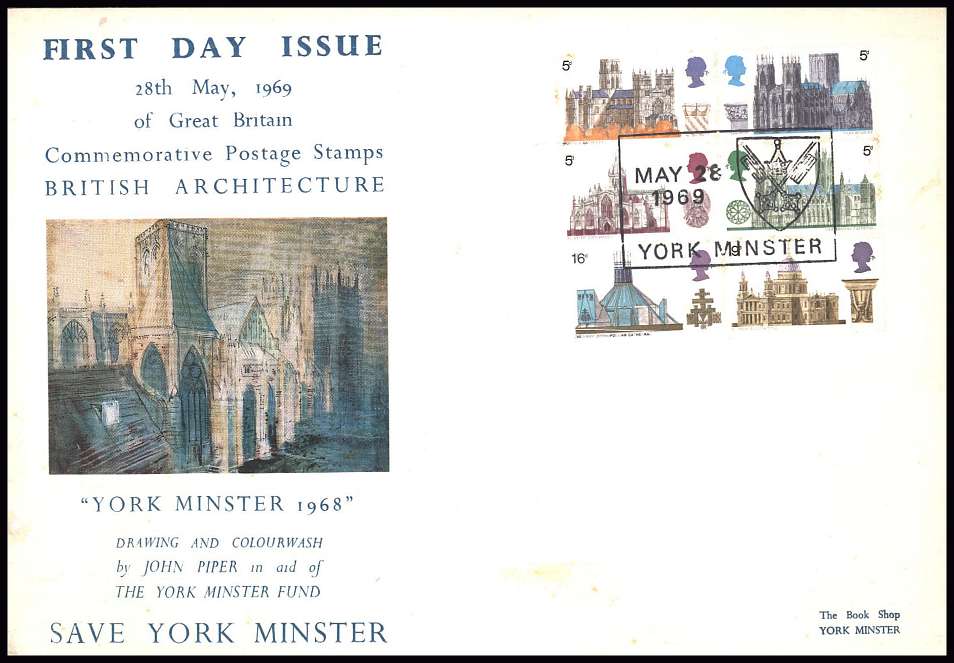 British Architecture - Cathedrals set of six on an unaddressed OFFICIAL SAVE YORK MINSTER FDC cancelled with a special handstamp for YORK MINSTER dated MAY 28 1969. The FDC has a feint stain in the address area reflected in price.Cat £50
