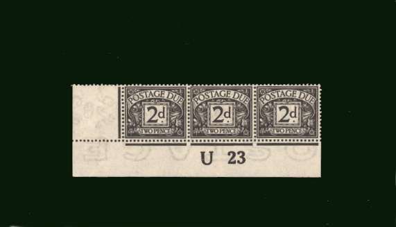 A fine lightly mounted mint control strip of three showing ''U 23'' IMPERF and WATERMARK SIDEWAYS-INVERTED