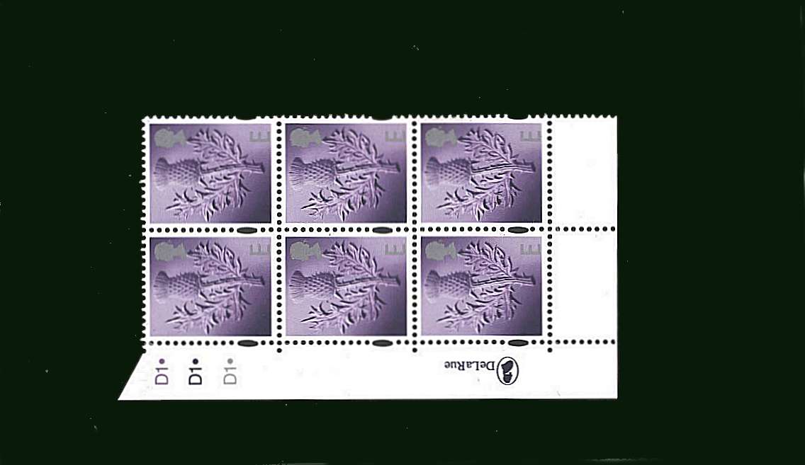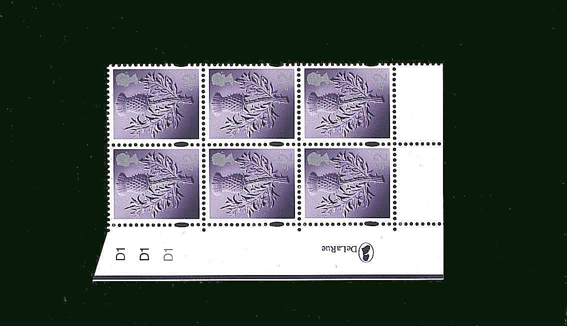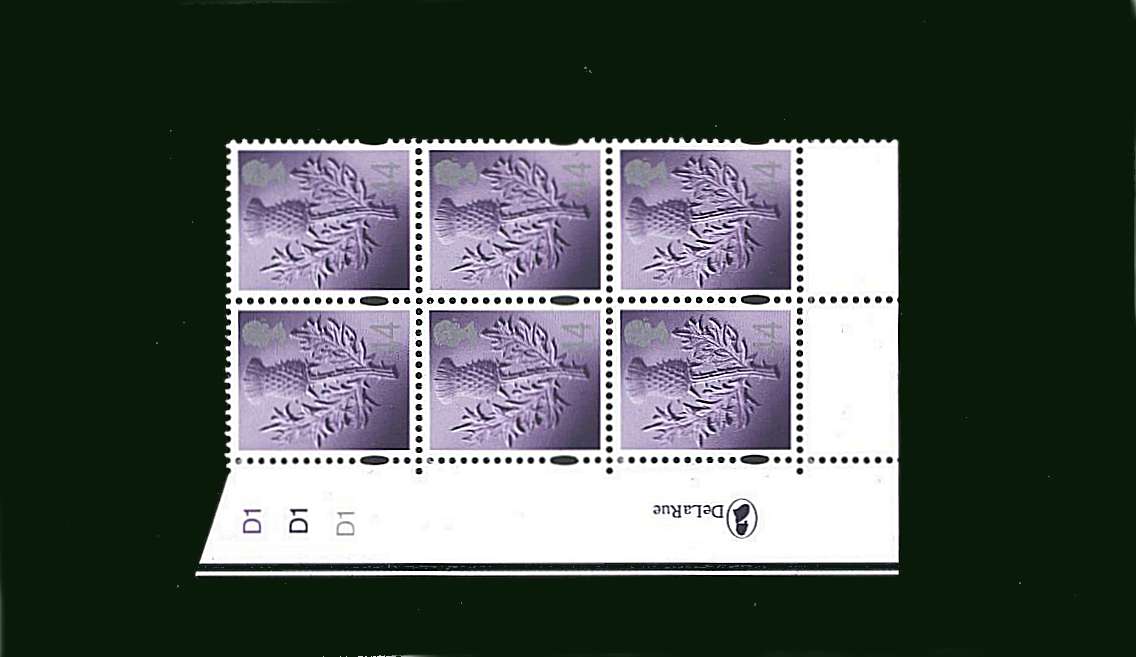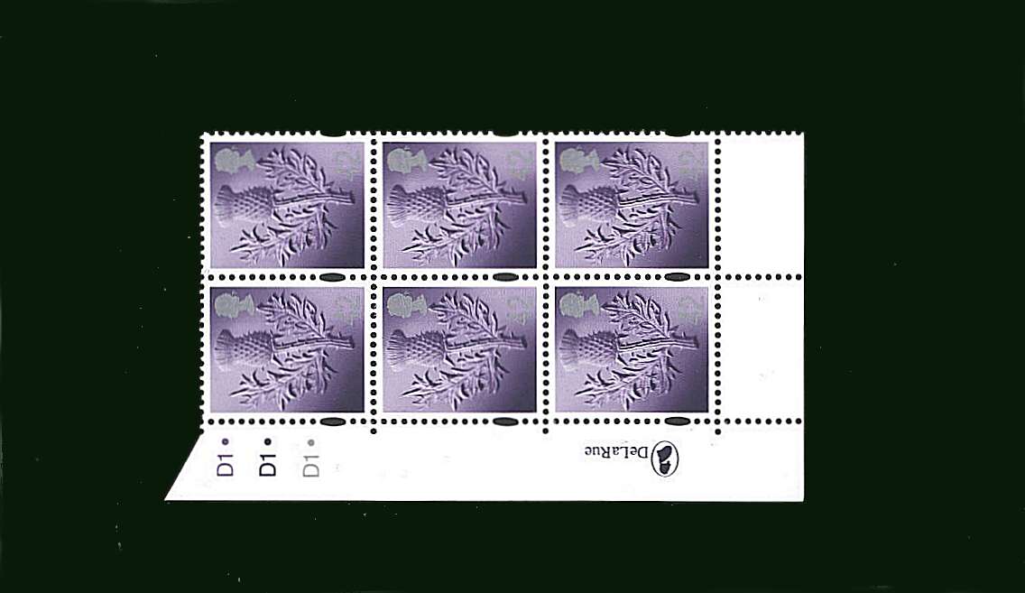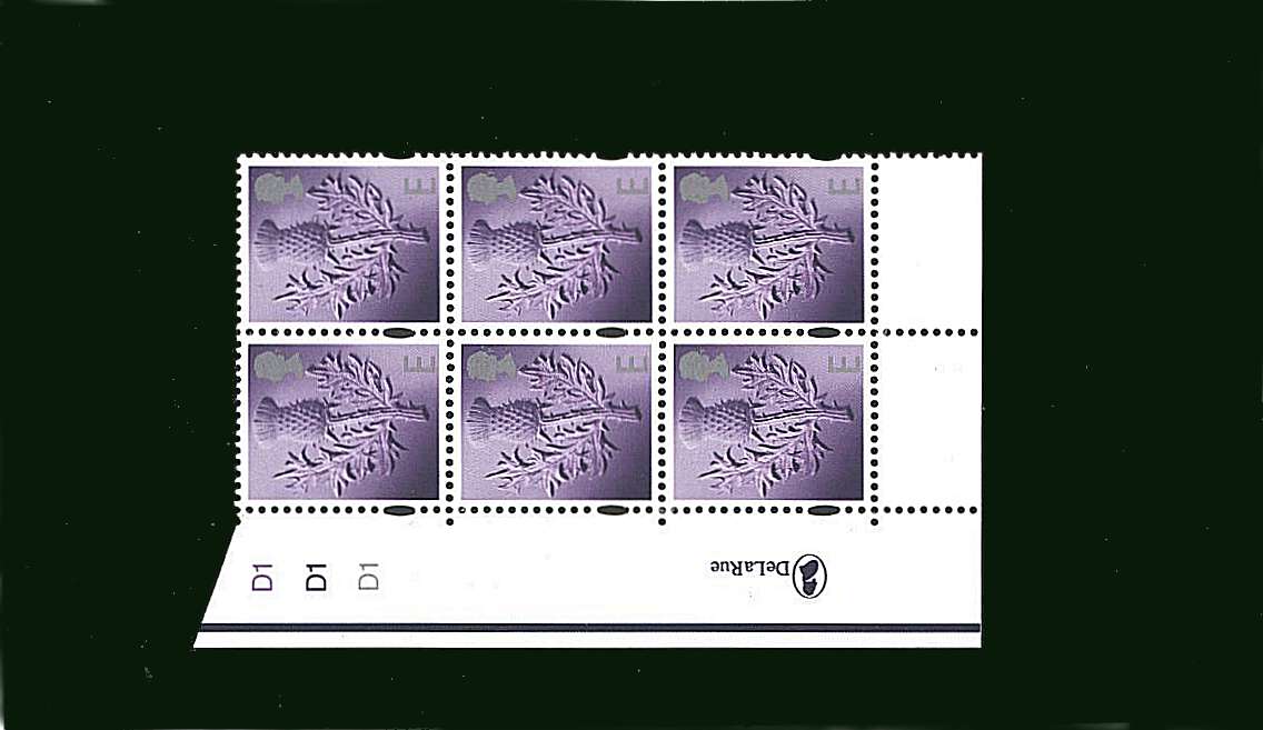 44p Bright Lilac, Deep Lilac and Silver in a superb unmounted mint cylinder block of six showing Cylinder D1 D1 D1 |
