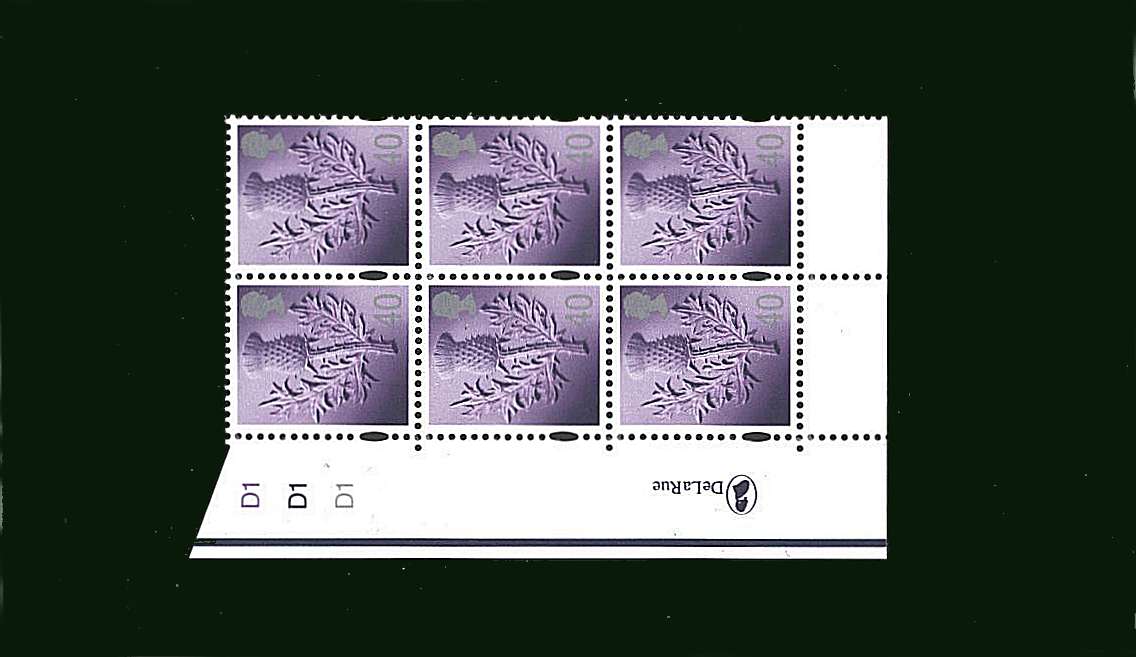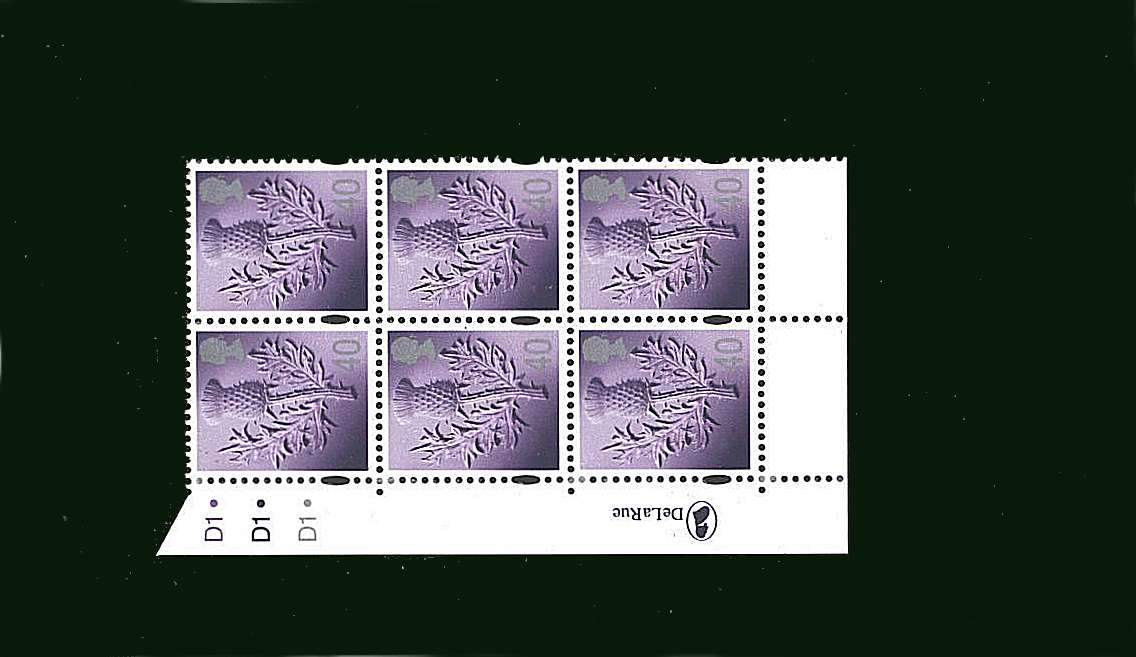 40p Bright Lilac, Deep Lilac and Silver in a superb unmounted mint cylinder block of six showing Cylinder D1 DOT D1 DOT D1 DOT |
