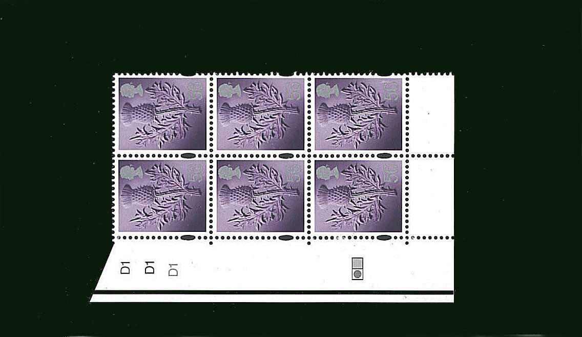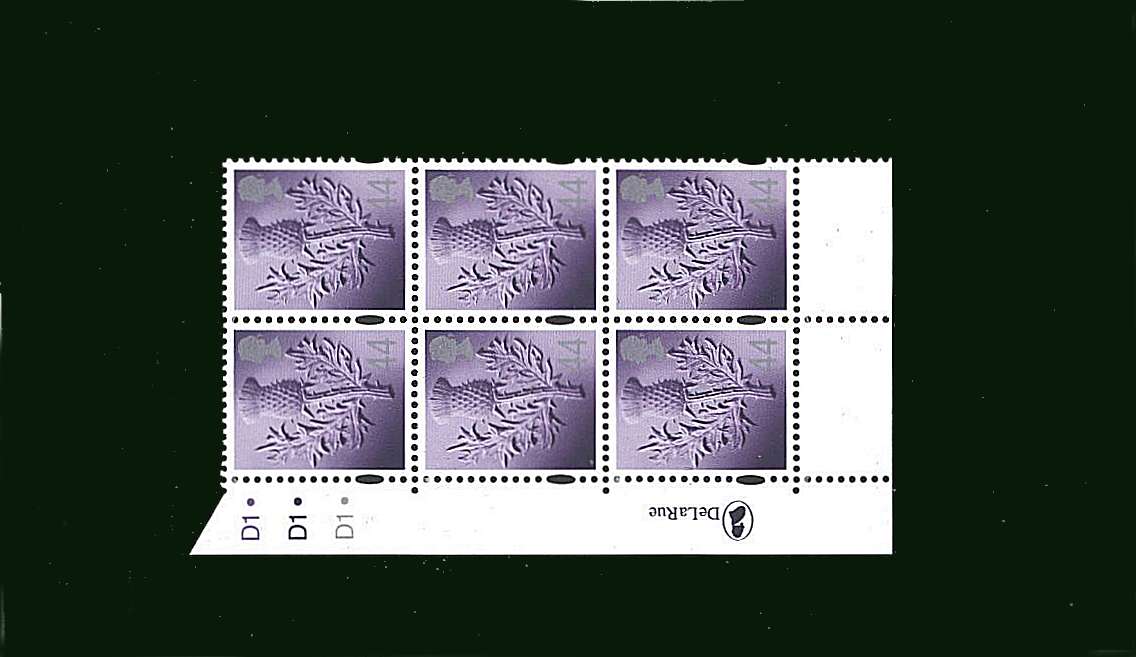 44p Bright Lilac, Deep Lilac and Silver in a superb unmounted mint cylinder block of six showing Cylinder D1 DOT D1 DOT D1 DOT |